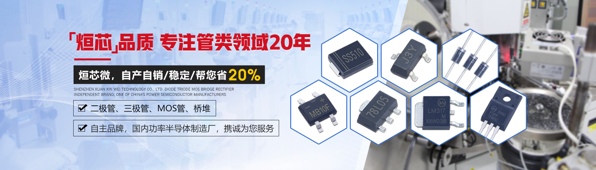 烜芯微是國內專業生產二三極管,MOS場效應管,橋堆,IC等,先進的生產設備以及專業的工程師,可以很好的幫助客戶朋友穩定好品質,全自動化一貫機,加快了生產速度,以及成本的下降,實現了品質,供貨速度與價格的優勢,我們20年來始終致力于電子元件的生產和銷售。本著“用最周到的服務、最可靠的產品質量讓客戶放心使用”的宗旨,烜芯微一直用科學的設計、嚴謹的生產流程、精湛的工藝立志締造出最優質的電子元件產品